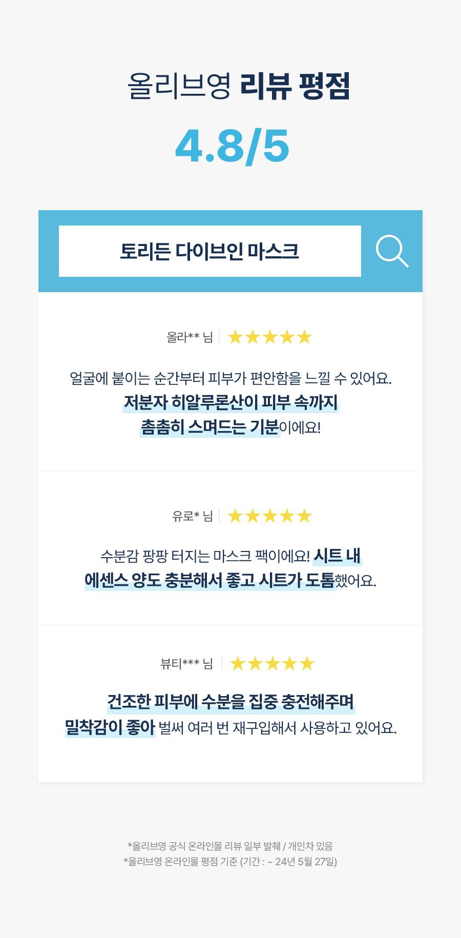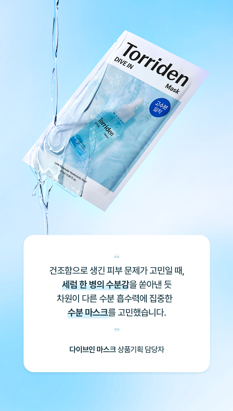 전성분 정제수, 부틸렌글라이콜, 글리세린, 다이프로필렌글라이콜, 소듐하이알루로네이트크로스폴리머, 소듐하이알루로 네이트, 소듐아세틸레이티드하이알루로네이트, 하이드롤라이즈드소듐하이알루로네이트, 하이드롤라이즈드하이알루로닉애씨드(100ppm), 판테놀, 트레할로오스, 알란토인, 마트리카리아꽃추출물, 포트마리골드꽃추출물, 인도멀구슬나무잎추출물, 인도멀구슬나무꽃추출물, 아이비고드열매추출물, 가지열매추출물, 홀리바질잎추출물, 울금뿌리추출물, 참산호말추출물, 글리세릴아크릴레
