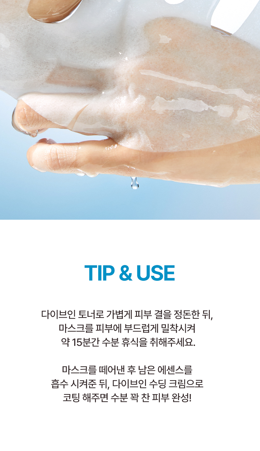 사용방법 1. 세안 후 마스크를 얼굴에 고르게 붙여 밀착합니다. 2. 15~20분 후 마스크를 떼어낸 후 남은 에센스를 가볍게 두드려 흡수시킵니다.