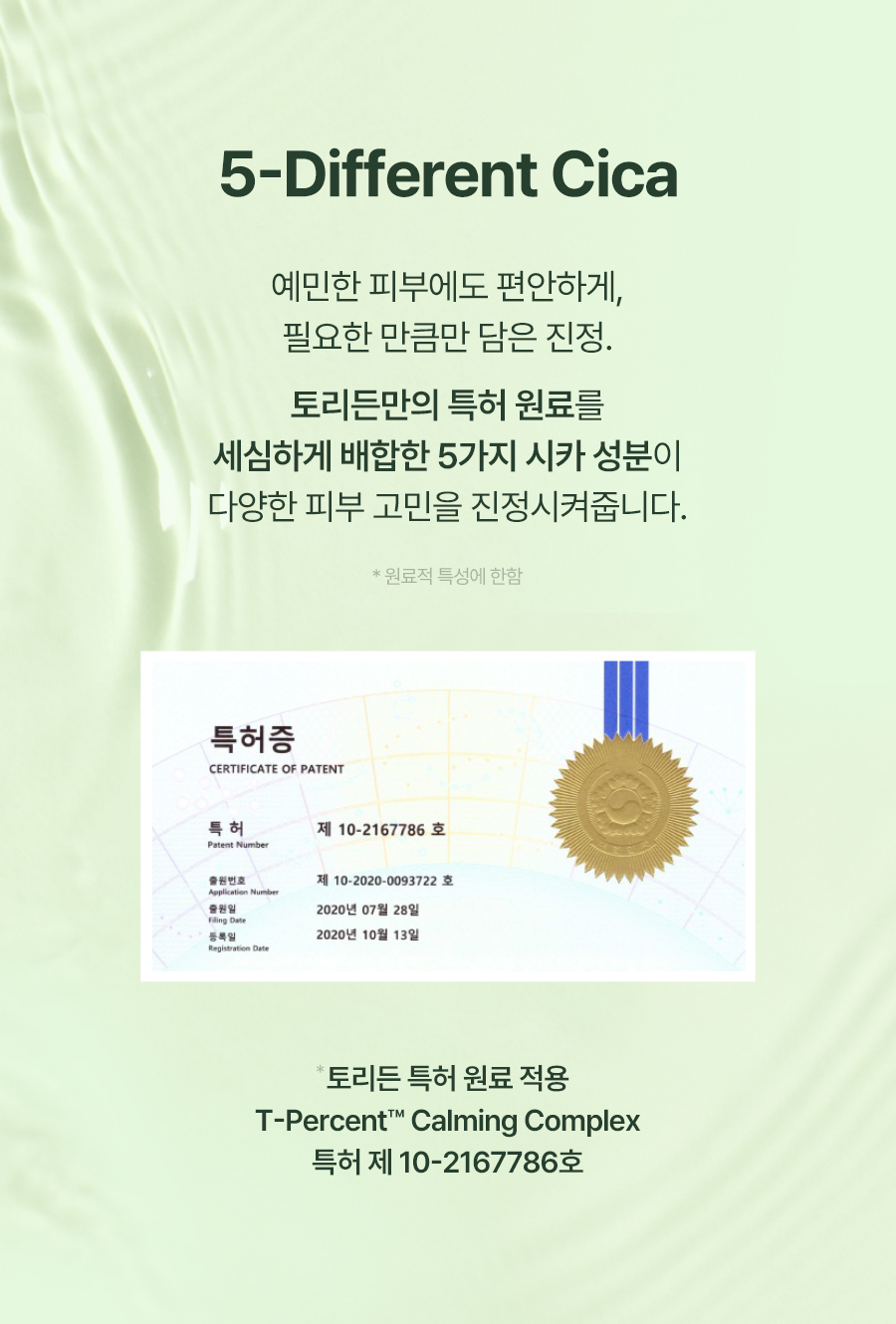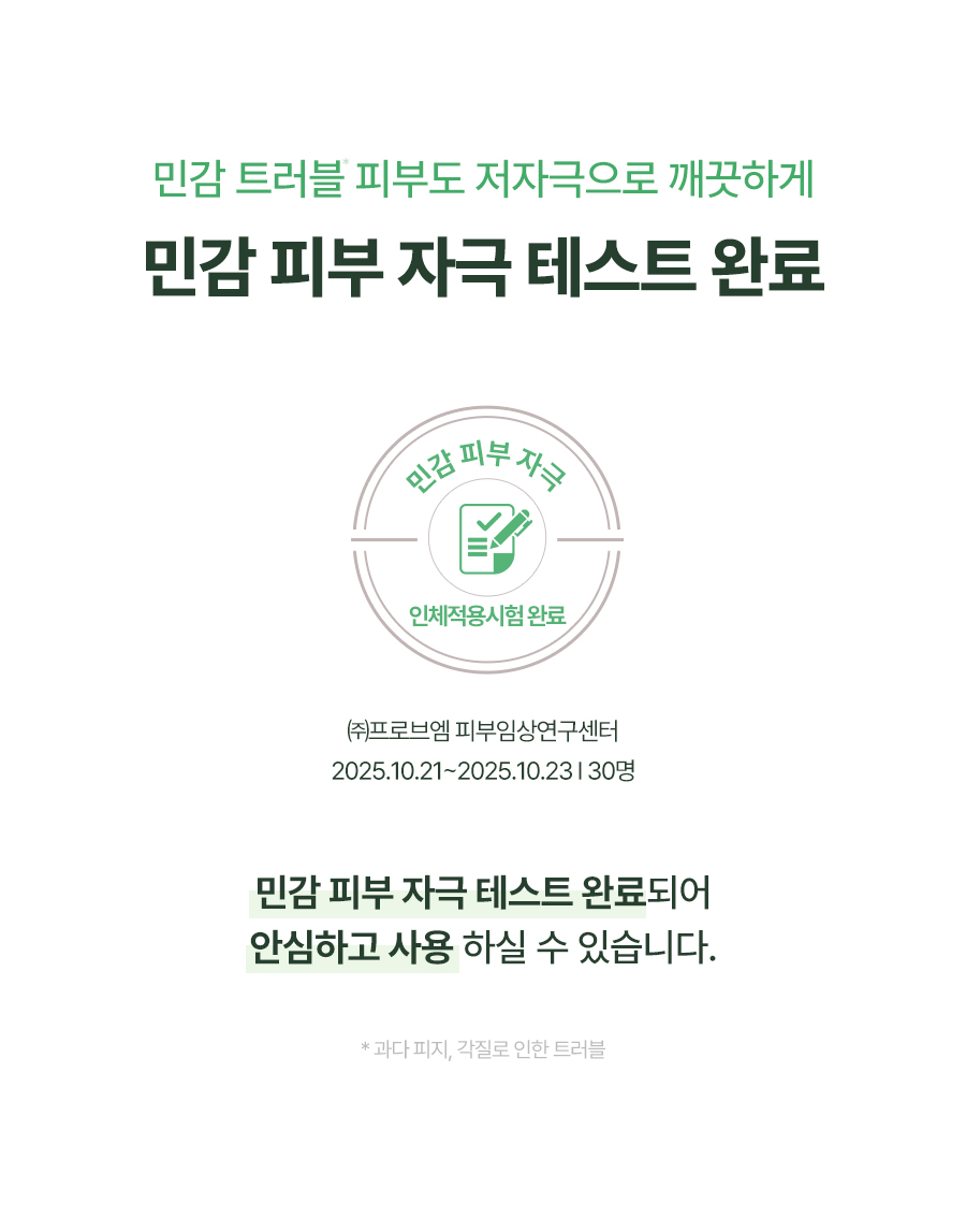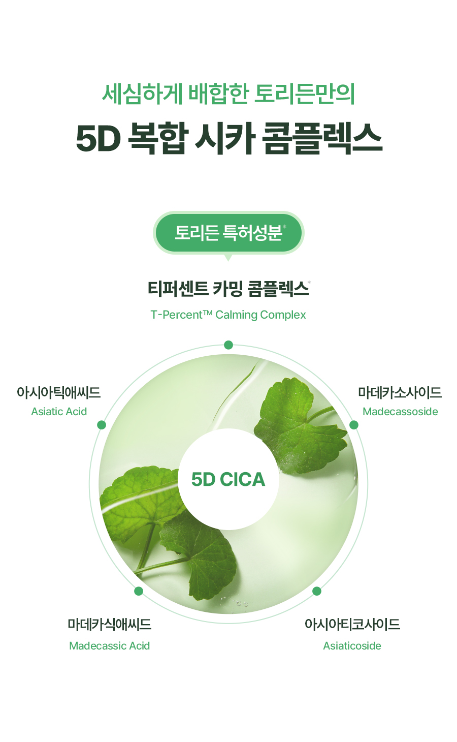 전성분 정제수, 글리세린, 포타슘라우레이트, 포타슘미리스테이트, 셀룰로오스, 아크릴레이트코폴리머, 1,2-헥산다이올, 판테놀, 병풀잎추출물, 병풀뿌리추출물, 병풀추출물, 마데카소사이드, 아시아티코사이드, 아시아틱애씨드, 마데카식애씨드, 쓴풀추출물, 푸른연꽃추출물, 락토바실러스발효물, 접시꽃추출물, 하이드롤라이즈드소듐하이알루로네이트, 스쿠알란, 카프릴로일살리실릭애씨드, 콘민트가루, 세라마이드엔피, 베타인, 칼라민, 팔미토일다이펩타이드-7, 다이포타슘글리시리제이트