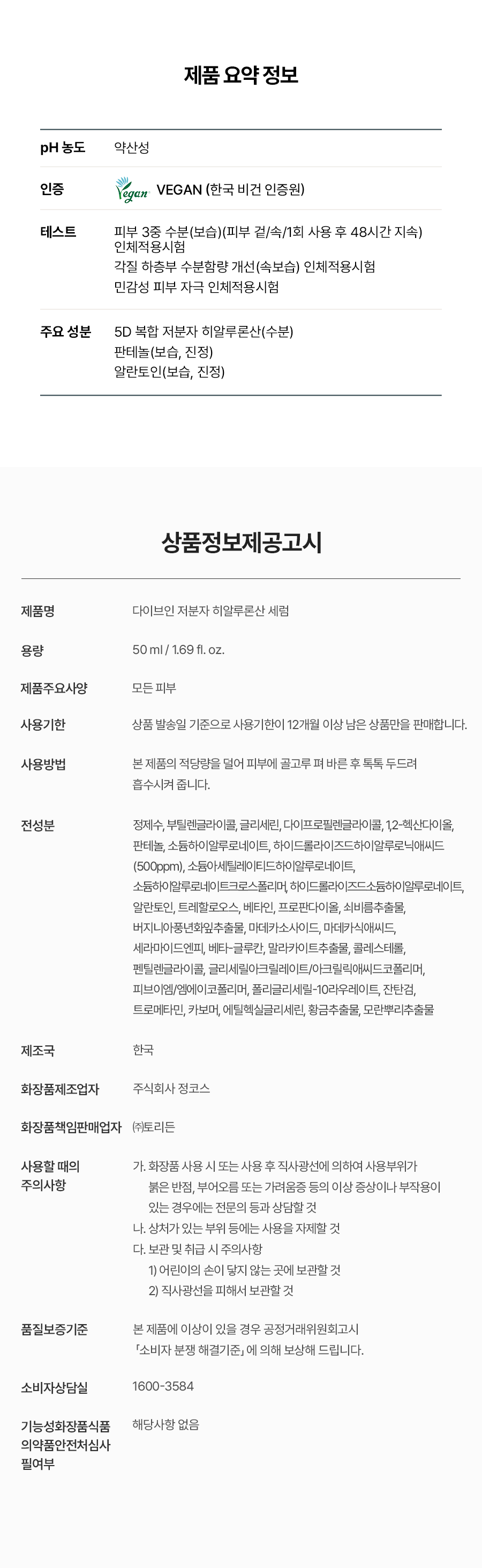 전성분 ● 세럼 : 정제수, 부틸렌글라이콜, 글리세린, 다이프로필렌글라이콜, 1,2-헥산다이올, 판테놀, 소듐하이알루로네이트, 하이드롤라이즈드하이알루로닉애씨드(500ppm), 소듐아세틸레이티드하이알루로네이트, 소듐하이알루로네이트크로스폴리머, 하이드롤라이즈드소듐하이알루로네이트, 알란토인, 트레할로오스, 베타인, 프로판다이올, 쇠비름추출물, 버지니아풍년화잎추출물, 마데카소사이드, 마데카식애씨드, 세라마이드엔피, 베타-글루칸, 말라카이트추출물, 콜레스테롤, 펜틸렌글